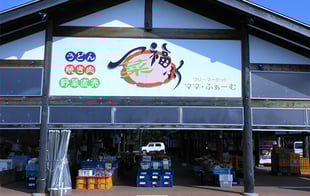 鳥取県北栄町・北条オートキャンプ場内にある「一菜ふく福(いっさいふくふく)」。店内は、うどんや焼肉などの飲食店のほか、地元の新鮮な野菜や果物、加工食品などの販売店が並び、地元食文化のアンテナショップとしてにぎわっています。